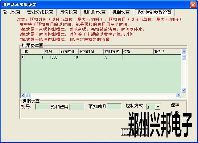 雙擊要修改水控費率的機器號,在機器設(shè)置中會出現(xiàn)機器的基本信息。輸入預(yù)扣費用及預(yù)扣時間,選擇控制方式后單擊【保存】按鈕即可。每更改一次費率都要下載一下水控機基本參數(shù)。