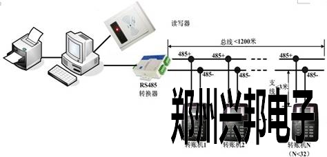 采用485通訊方式,如圖:485通訊須要自助轉(zhuǎn)賬機(jī)與電腦之間連線、距離不能超過(guò)1200米,自助轉(zhuǎn)賬機(jī)可以設(shè)在充值點(diǎn)旁邊,或食堂內(nèi)。