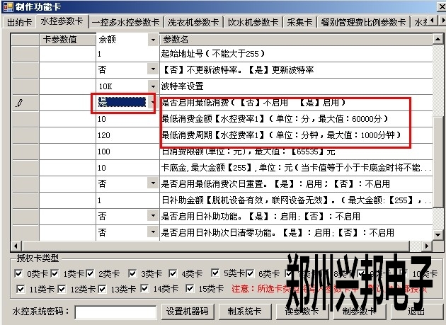 2)打開(kāi)軟件 制卡中心-功能卡制作-水控參數(shù)卡中的最低消費(fèi)周期,先選擇啟用,然后輸入最低消費(fèi)金額和最低消費(fèi)周期,最低消費(fèi)金額以分為單位,最低消費(fèi)周期以分鐘為單位,設(shè)置好后點(diǎn)擊制參數(shù)卡即可;