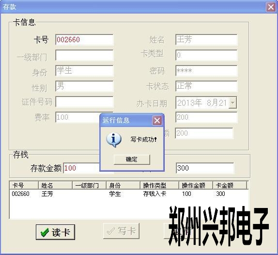 正常的情況是將卡放在讀卡器上,點(diǎn)擊【讀卡】出現(xiàn)卡信息,在存款金額右邊的文本框中輸入存款金額,然后點(diǎn)擊【寫卡】,提示寫卡成功后點(diǎn)擊【確定】按鈕即可。存錢后最大卡金額不能超過9999.99