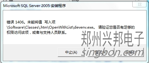 客戶使用我們的互聯(lián)網(wǎng)一卡通食堂售飯機(jī),自己安裝SQL2005數(shù)據(jù)庫沒裝成功,讓我們遠(yuǎn)程再重裝一次,在控制面板里卸載后并刪除之前的安裝文件,又重新安裝時(shí)提示:錯(cuò)誤1406。未能將值 寫入項(xiàng)\Software\Classes\.htm\OpenWithList\devenv.exe。請(qǐng)驗(yàn)證您是否有足夠的權(quán)限訪問該項(xiàng),或者與支持人員聯(lián)系。這時(shí)該怎樣解決呢?